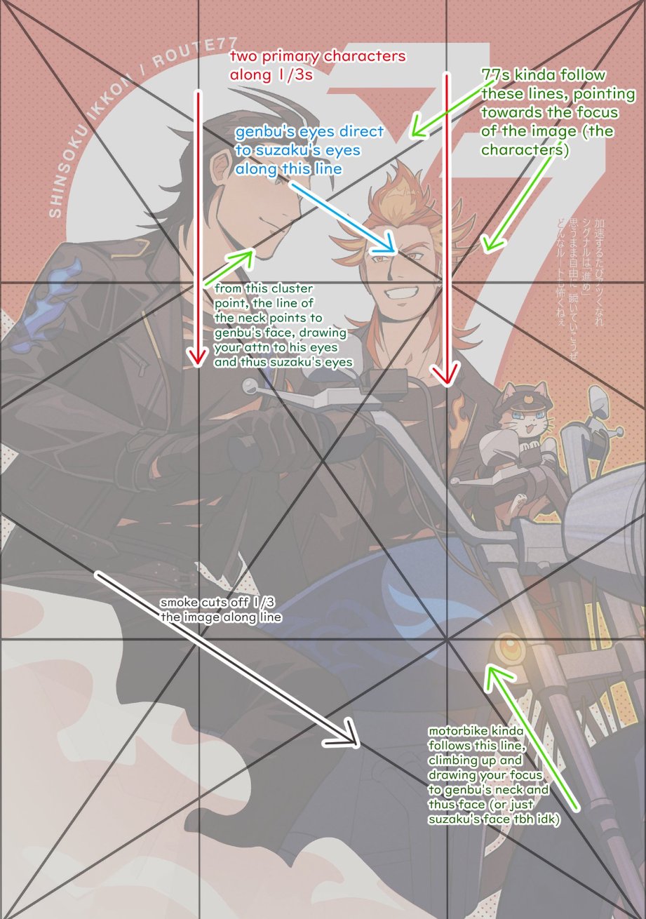 i also drew shinsoku ikkon's page artwork! TBH i was actually the only person who chose shinsoku as my first choice for the page art (none of the other units had this problem LMFAO) so i wanted to go extra hard for it. i tried using dynamic symmetry for the first time. i still feel like it's a kinda bullshit composition technique but it looks cool so maybe it worked?